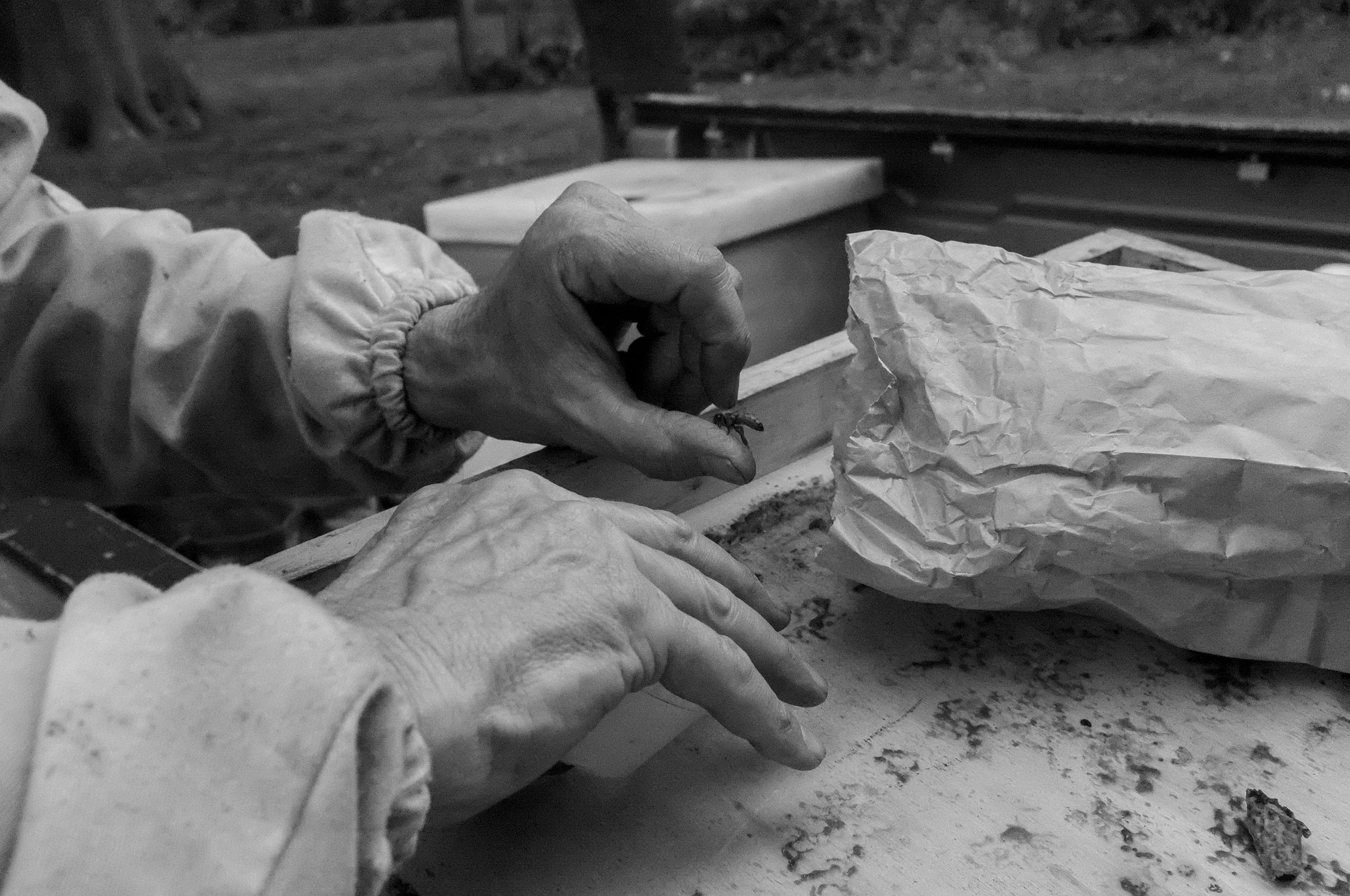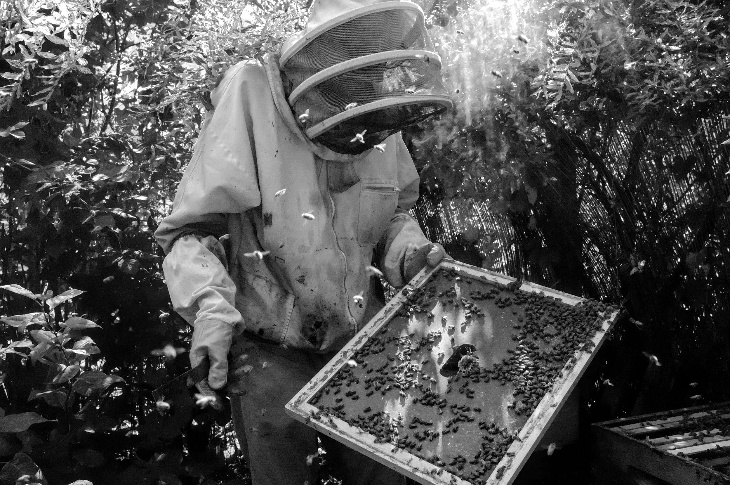 No bee-suit, no protective-wear — swarms of anxious and curious honey bees side-swiped my face and arms while I photographed, but besides the occasional landings on my face, the bees didn’t mind me. Bill is the beekeeper in these images, his experience in beekeeping is extensive and fascinating; photographing and interviewing him was insightful to say the least! Beekeeping various a wide amount; alongside honey-bees, there are native-bees; creating bee-hotels and maintaining native pollinator habitats establishes a great way of keeping bees, without the added effort (native-bees don't produce honey for extraction, and many, almost all are solitary.)