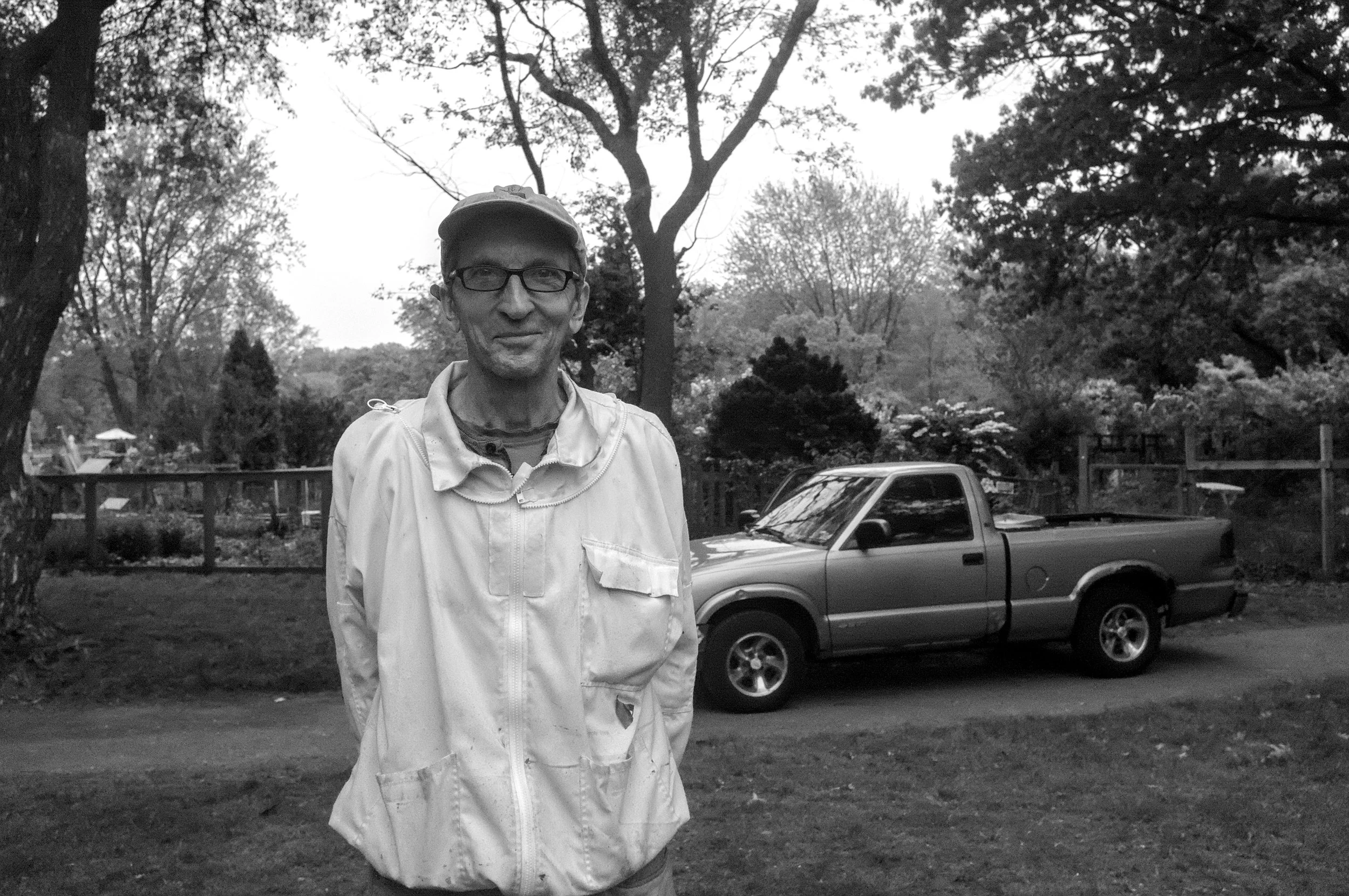 Bill in front of his truck near one of his bee-hives at Fenway’s Victory Garden.